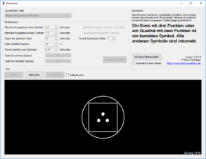 Dies ist ein einfaches Programm, das einen Konzentrationstest bzw. Reaktionstest nachbildet, wie er — so wurde vielfach berichtet — beim Einstellungstest (Eignungsauswahlverfahren, EAV) der Polizei vorkommt, zumindest bei der Polizei in Hessen und in Rheinland-Pfalz (und möglicherweise auch in anderen Bundesländern). Es geht darum, auf das Erscheinen von verschiedenen Symbolen so schnell wie möglich durch das Drücken der richtigen Taste zu reagieren. Da dieser Test für viele Bewerber problematisch ist, habe ich dieses Programm geschrieben, mit dem man für den Test üben kann.